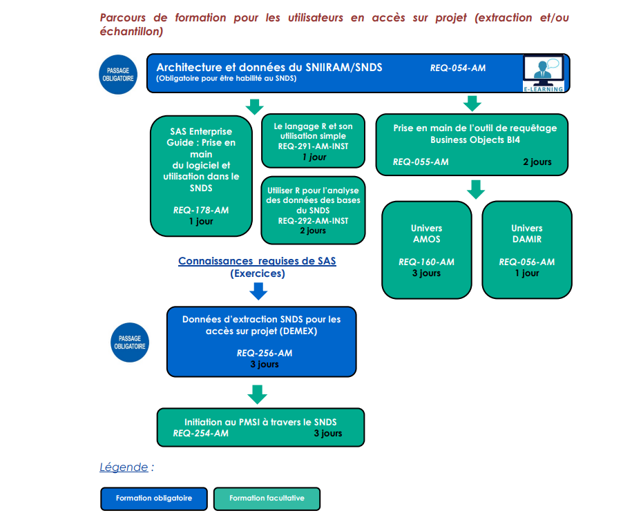 En consultant le schéma de parcours de formation disponible sur le site du SNDS, j’ai bien identifié qu’il existe des modules obligatoires (par exemple Architecture et données du SNIIRAM/SNDS ou Données d’extraction SNDS – DEMEX) ainsi que des modules facultatifs.